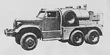 In addition to the ponton and dump trucks the Engineers used over 2,000 chassis for specialty bodies. Two similar engineer bodies were mounted on short wheelbase chassis. Distributors are tank trucks with nozzles on the rear to spread the liquid in an even pattern when the truck drives forward. A water distributor carried 1,000 US gallons (3,800 L), an asphalt distributor carried 800 US gallons (3,000 L) and had a heater to keep the asphalt warm.[31]