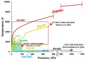 During the following decades DACs have been successively refined, the most important innovations being the use of gaskets and the ruby pressure calibration. The DAC evolved to be the most powerful lab device for generating static high pressure.[15] The range of static pressure attainable today extends to 640 GPa, much higher than the estimated pressures at the Earth's center (~360 GPa).[16]