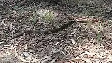 The diamond python is typically inoffensive by nature and generally reluctant to bite. This python is an ambush predator with large territories that often overlap. It moves around these territories seasonally to occupy well camouflaged positions in the warmer months and brumate in the winter months. Females have ranges up to 50 ha (120 acres); males may occupy areas almost twice as large. The diamond python is often active during the day and on warm nights, although most of its time is spent waiting in ambush for passing prey. It typically remains in one position for up to two weeks, before moving to another around 100 m (330 ft) away.[4] M. s. spilota kills its food by constricting and suffocating it, and preys on lizards, birds, and mammals as large as possums. It is not a danger to humans, but is capable of biting and leaving teeth in the wound if severely harassed.[5]