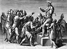 On June 5, 1575, the year of her first dated print, Scultori received the Papal Privilege to make and market her own work.[5] Applying for a Papal Privilege was a fairly unusual practice before the papacy of Gregory XIII, especially for women, and it allowed her to establish a name for her household. Resembling a book-printing privilege, it is about 300 words in length and names Diana as “wife of Franciscus Cipriani the architect, who is staying in this our alma Urbe...” and indicates that she learned her art from her father. The privilege suggests that Diana applied for it because she was reluctant to print her engravings without a license and it was to protect her engravings from being copied and then sold “by others of either sex, but most especially book dealers, sculptors, engravers and printers”. The privilege rendered any unlicensed publisher or vendor of her engravings liable to a heavy fine of approximately 500 ducati. Of this, one third would have gone to the Pope in office, one third to Diana, and the final third to the judge who issued the decision, naturally encouraging a judgment in favor of the artist. In addition to such a fine, the punishment also included immediate excommunication from the Catholic Church.[4][7]