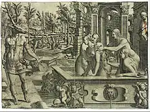 Diane and Actaeon's myth has also deeply inspired the French film/theatre director, writer and visual artist Jean Michel Bruyère and his collective LFKs, who produced a series of 600 shorts and "medium" films, an interactive 360° installation, Si poteris narrare licet ("if you are able to speak of it, then you may do so")[4] in 2002, a 3D 360° installation La Dispersion du Fils[5] (from 2008 to 2016) and an outdoor performance, Une Brutalité pastorale (2000) all about the myth of Diana and Actaeon.