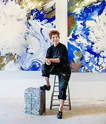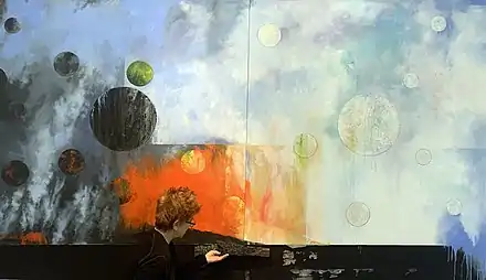 ![]() Burko in her studio, 2016. Paintings "Arctic Melting, July 2016 (After NOAA)" and "Arctic Melting, July 2016 (After NASA)" are hung on the studio wall in the background. | |