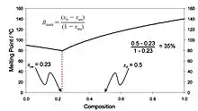 The second step, once the diastereomers have formed, is to separate them using recrystallisation. This is possible because enantiomers have shared physical properties such as melting point and boiling point, but diastereomers have different chemical properties, so they can be separated like any two different molecules. It is these, now different, physical properties e.g. Melting point & Enthalpy of fusion which determine the eutectic composition (see Eutectic system) which correlates with the maximum yield of pure diastereomer in the crystallization (Rmax, see example melting point phase diagram of a diastereomeric system across all compositions in Figure 1). Various methods have been developed to screening diastereomeric resolutions by determining the eutectic composition as a means of ranking for yield efficiency.[3]