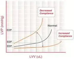 In diastolic heart failure, the volume of blood contained in the ventricles during diastole is lower than it should be, and the pressure of the blood within the chambers is elevated.[29]