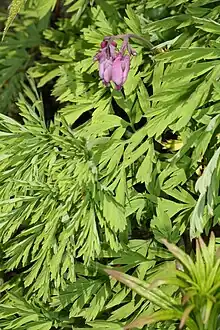 Pacific bleeding-heart is a perennial herbaceous plant. Its leaves are three to four times divided and fern-like, growing from a brittle rhizome at the base of the plant. It grows to 18 in (45 cm) tall by 24 in (60 cm) wide.[6][7][8][9]