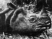 The Javan rhinoceros (Rhinoceros sondaicus) is one of the most endangered large mammals in the world.[23] According to 2015 estimates, only about 60 remain, in Java, Indonesia, all in the wild. It is also the least known rhino species. Like the closely related, and larger, Indian rhinoceros, the Javan rhino has a single horn. Its hairless, hazy gray skin falls into folds into the shoulder, back, and rump, giving it an armored appearance. Its length reaches 3.1–3.2 m (10–10 ft) including the head, and its height 1.5–1.7 m (4 ft 11 in – 5 ft 7 in). Adults are variously reported to weigh 900–1,400 kg[24] or 1,360–2,000 kg.[25] Male horns can reach 26 cm in length, while in females they are knobs or altogether absent.[25] These animals prefer dense lowland rain forest, tall grass and reed beds that are plentiful with large floodplains and mud wallows.