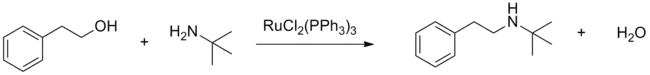 Dichlorotris(triphenylphosphine)ruthenium(II) serves as a precatalyst for the hydrogenation of alkenes, nitro compounds, ketones, carboxylic acids, and imines. On the other hand, it catalyzes the oxidation of alkanes to tertiary alcohols, amides to t-butyldioxyamides, and tertiary amines to α-(t-butyldioxyamides) using tert-butyl hydroperoxide. Using other peroxides, oxygen, and acetone, the catalyst can oxidize alcohols to aldehydes or ketones. Using dichlorotris(triphenylphosphine)ruthenium(II) the N-alkylation of amines with alcohols is also possible (see "borrowing hydrogen").[8]