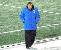 Advocaat was born in The Hague[2] and was a defensive midfielder during his playing days.[3] His career began as an 18-year-old with Hague club ADO Den Haag,[4] and he made his professional debut with the club on 21 May 1967 in a 3–0 win against GVAV.[5][6][7] He only featured for Den Haag once more that season,[6] and that summer, the San Francisco Golden Gate Gales franchise imported the Den Haag team, which included Advocaat, to play for six weeks in the United Soccer Association as part of an effort to make the sport more popular in the United States.[8] It was the following season that Advocaat won his only honour as a player, the KNVB Cup, in 1968.[4] In the 1969–70 season, he became a regular in the side, making 29 appearances and scoring his first goal for the club. He made 33 appearances the season after that.[6] From the 1971–72, the club merged with Holland Sport to become FC Den Haag. That season, his final one for the club, Advocaat made a further 66 appearances and scored 6 goals.[6] In total, he made 147 appearances and scored 7 goals for the club.[6]