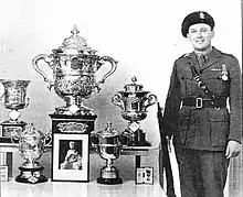 His marksmanship was also unsurpassed in the Army Operational Shooting Competition at Bisley. He won the Bronze Jewell award there at the 1947, 1954 and 1955 competitions, and in 1951 he won the Silver Jewell as well. He ultimately shot in the Army competitions for 11 consecutive years (except 1953), and his name appears on every individual Rifle Championship Cup save one in the Army Rifle Association.