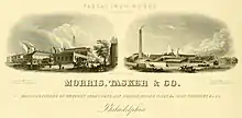 During the 19th century, Pascal Iron Works was situated in the squares between Moyamensing road and Fifth street, and Franklin (later Tasker) and Morris streets,[6] then only the block between Fourth and Fifth streets. Stephen Paschall (1800-1865) formed Paschall Iron Works in 1821. In 1835 he was joined by his brother, Henry Morris, and Thomas T. Tasker, a Philadelphia preacher with a penchant for mechanics, to form S. P. Morris & Company. Sometime between 1835 and 1856, S. P. Morris & Co. became known as Morris Tasker & Morris, when another brother, Wistar Morris (1815-1891), took the place of retiree Stephen Paschall. By 1856, the organization's name had changed once more to Pascal Iron Works and Morris, Tasker & Company. These companies manufactured a number of different iron products throughout the 1800s, including stoves, grates, pipes, valves, fountains, radiators, and fire hydrants.[7][8][9]