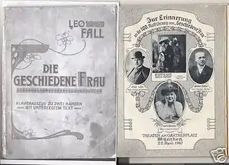 Die geschiedene Frau (The Divorcée), is an operetta in three acts by Leo Fall with a libretto by Victor Léon based on Victorien Sardou's Divorçons!.[1] Conducted by the composer, It opened to considerable success at the Carltheater in Vienna on 23 December 1908 with Hubert Marischka as Karel.[2]