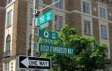 In 2009, D'Ambrosio was awarded the Order of the Star of Italian Solidarity at the Italian Embassy, in recognition of his promotion of his Italian heritage.[4] On April 23, 2010, D.C. Mayor Adrian Fenty joined other local government officials in designating the 1900 block of Q Street, N.W., as Diego D’Ambrosio Way (an alternative street name). The Diego D'Ambrosio Way Designation Act of 2010 "officially recognizes Diego's contributions to District of Columbia residents and the city’s business community."[5]