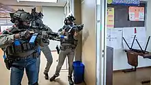 The Intervention Department (Dutch: Afdeling Interventie, AI) is a mixed unit consisting of both law enforcement and military operators, which main tasks are to conduct the arrest of terror suspects and organised crime figures, and to neutralise ongoing terror attacks. The mixed unit consist of approximately one third operators of M-Squadron (NLMARSOF) and the Korps Commandotroepen, one third operators of the police ATs and one third AT operators of the BSB.[12] Operators of these units are attached to the Intervention Department for a period of time and are required to complete the AT and National Intervention Course beforehand.
