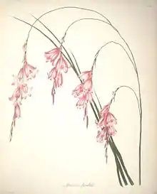 Dierama pendulum, commonly known as fairy bell, hair bell and wedding bell,[2] is a species of Iridaceae endemic to the Eastern Cape in South Africa and first collected in 1772 by the Swedish naturalist Carl Peter Thunberg near Essenbos on the Kromme River or Kromrivier which flows down the Langkloof. In 1845 the genus Dierama was established by Karl Koch (1809-1879) based on this specimen. Before that the plant had been placed in various genera including Ixia, Sparaxis and Watsonia. The species name has been misapplied to D. inyangense,[3] D. densiflorum[4] and to D. plowesii.[5]
