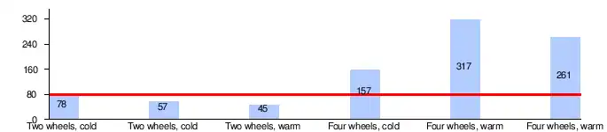 The engine software changed the engine behavior based on whether two or four wheels were rotating. In an Opel Zafira front-wheel-drive vehicle, the NOx emissions were within the 80 mg/km legal limit – but only when the vehicle was on a test stand, with the front wheels rotating and the rear wheels being stationary. When the rear, unpowered wheels were made to rotate too (which is how a front-wheel-drive vehicle behaves on the road), the NOx emission were twice the limit (cold engine) or three to four times the limit (warmed-up engine).[19][20][21]