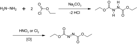 Although available commercially, diethyl azodicarboxylate can be prepared fresh in the laboratory, especially if required in pure, non-diluted form. A two-step synthesis starts from hydrazine, first by alkylation with ethyl chloroformate, followed by treating the resulting diethyl hydrazodicarboxylate with chlorine (bubbling through the solution), hypochlorous acid, concentrated nitric acid or red fuming nitric acid. The reaction is carried out in an ice bath, and the reagents are added dropwise so that the temperature does not rise above 20 °C. Diethyl hydrazodicarboxylate is a solid with melting temperature of 131–133 °C which is collected as a residue; it is significantly more stable to heating than DEAD and is conventionally dried at a temperature of about 80 °C.[4][13]