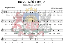 "Dievs, svētī Latviju!" (Latvian pronunciation: [diɛu̯s svɛːtiː ˈlatviju]; "God Bless Latvia!") is the national anthem of Latvia. Created in 1873 as a patriotic song, it did not gain official status until 1920.