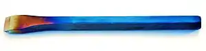 Before the yellow or "light-straw" color reaches the edge, the smith removes the heat. The heat will continue to conduct, moving the colors toward the edge for a short time after the heat is removed. When the light-straw color reaches the edge, the smith will usually dip the steel in water, to stop the process. This will generally produce a very hard edge, around HRc58-60 on the Rockwell scale, but will leave the opposite end of the tool much softer. The hardness of the cutting edge is generally controlled by the chosen color, but will also be affected primarily by the carbon content in the steel, plus a variety of other factors. The exact hardness of the soft end depends on many factors, but the main one is the speed at which the steel was heated, or how far the colors spread out. The light-straw color is very hard, brittle steel, but the light-blue is softer and very springy. Beyond the blue color, when the steel turns grey, it is more likely to be very malleable, which is usually undesirable in a chisel. If the steel is too soft it can bend or mushroom, plastically deforming under the force of the hammer.[22]