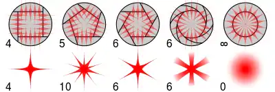 Iris diaphragms with moving blades are used in most modern camera lenses to restrict the light received by the film or sensor. While manufacturers attempt to make the aperture circular for a pleasing bokeh, when stopped down to high f-numbers (small apertures), its shape tends towards a polygon with the same number of sides as blades. Diffraction spreads out light waves passing through the aperture perpendicular to the roughly-straight edge, each edge yielding two spikes 180° apart.[7] As the blades are uniformly distributed around the circle, on a diaphragm with an even number of blades, the diffraction spikes from blades on opposite sides overlap. Consequently, a diaphragm with n blades yields n spikes if n is even, and 2n spikes if n is odd.[8]