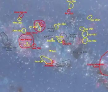 Close up on the Orion Arm, with major stellar associations (yellow), nebulae (red) and dark nebulae (grey) around the Local Bubble.
