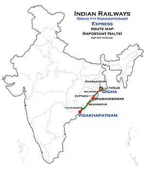 The 22873 / 74 Digha–Visakhapatnam Express runs from Digha via Kharagpur Junction, Khurda Road Junction, Vizianagaram Junction to Visakhapatnam.