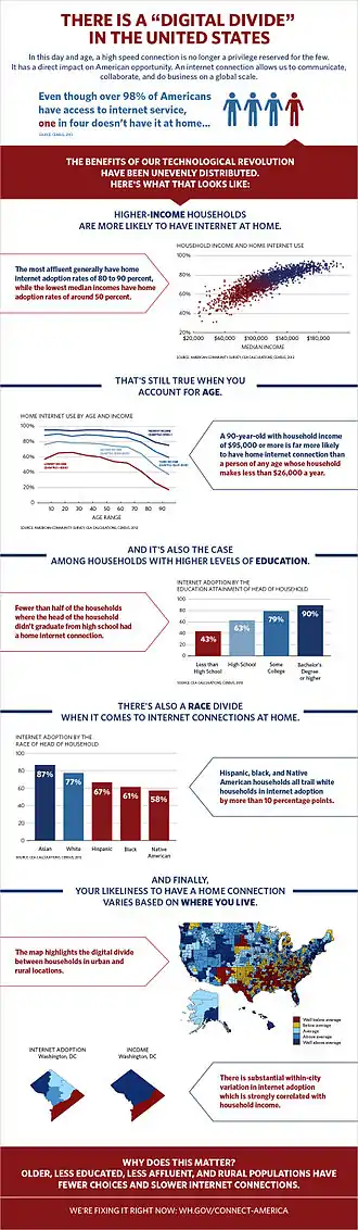 The digital divide in the United States refers to inequalities between individuals, households, and other groups of different demographic and socioeconomic levels in access to information and communication technologies ("ICTs") and in the knowledge and skills needed to effectively use the information gained from connecting.[1][2][3][4]