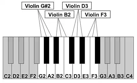 For example, in Fig 1, a keymap has been created with four different samples. Each sample, if pitched, should be associated with a particular center pitch. The first sample (Violin G#2) is distributed across three different notes, G2, G#2, and A2. If the note G#2 is received the sampler will play back the Violin G#2 sample at its original pitch. If the note received is G2 the sampler will shift the sample down a semitone while the note A2 will play it back a semitone tone higher. If the next note (Bb2) is input the sampler will select the Violin B2 sample, playing it a semitone lower than its center pitch of B2.