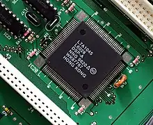 In 1978, American Microsystems (AMI) released the S2811.[3][4] The AMI S2811 "signal processing peripheral", like many later DSPs, has a hardware multiplier that enables it to do multiply–accumulate operation in a single instruction.[18] The S2281 was the first integrated circuit chip specifically designed as a DSP, and fabricated using VMOS (V-groove MOS), a technology that had previously not been mass-produced.[4] It was designed as a microprocessor peripheral, for the Motorola 6800,[3] and it had to be initialized by the host. The S2811 was not successful in the market.