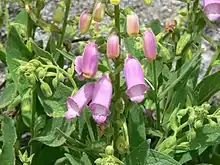 A Missouri Botanical Garden website calls it mullein foxglove.[2] Local vernacular names recorded for this species are abeloura, abeloura-amarelada, aboleira, aveloeira, dedaleira, luvas de Santa María, pegajo and rabo de raposa in Portuguese, whereas in Spanish the most common name is dedalera, followed by viloria, viluria, giloria, dedales and mataperla, but it has also been called abiloria, abiluria, abortones, bacera, beleño, biloria, biluria, campanilla, cascante, cascaor, chupadera, chupamieles, chupera, cohete, cohetera, cohetes, deales, dedales de niño, dedales purpúreos, dediles, digital, digitalis, emborrachacabras, estallones, goldaperra, guadalperra, gualdaperra, guardaperros, hueltaperra, mata de lagartija, mataperros, rabera, ravera, raéra, restalladera, restralleti, restrallos, sabia, tuercecuellos and vueltaperra.[3][4]