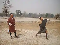 Digor is played with a pair of spherical flat stones that are hurled at two targets (pegs) fixed in the ground about 20 meters apart. The game is played all over Bhutan, but typically more in rural areas, and more often by men.