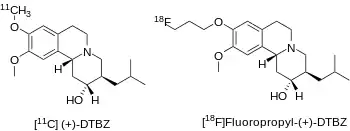 [11C]DTBZ as a PET radioligand with affinity for VMAT2 was developed in the mid 1990s by David E. Kuhl and colleagues at the University of Michigan.[3] There are two enantiomers of alpha-dihydrotetrabenazine, and the dextrorotary(or (+) isomer) has a high affinity of about 1 nanomolar Ki whereas the levorotary (or (-) isomer) has approximately 1000 fold lower affinity with a Ki of about 2 micromolar.[4]