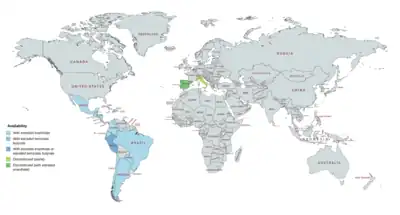 DHPA has been available for use both alone and in combination with estrogens.[8][9][25][62][63][7] It was marketed alone under the brand name Neolutin Depositum in Italy, but this preparation was discontinued.[8][7][57] DHPA has been marketed in combination with estradiol enantate (E2-EN) as a combined injectable contraceptive in at least 19 countries, mostly in Latin America.[5][18][23][16][8][9][62][63] A few different preparations, with varying doses of E2-EN and DHPA and varying availability, have been introduced.[23][5][18][22][25][4][54] These formulations have the following approval and availability († = discontinued in this country):[8][9][62][63][22][23][5][18][4]