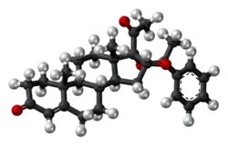 DHPA, also known as 16α,17α-dihydroxyprogesterone acetophenide, as well as 16α,17α-dihydroxypregn-4-ene-3,20-dione cyclic acetal with acetophenone or as (R)-16α,17-[(1-phenylethylidene)dioxy]pregn-4-ene-3,20-dione, is a synthetic pregnane steroid and a derivative of progesterone.[56][7][57] It is specifically a derivative of 17α-hydroxyprogesterone with an additional hydroxyl group at the C17α position, or of algestone (16α,17α-dihydroxyprogesterone), and with the two hydroxyl groups cyclized into an acetophenide moiety (a cyclic acetal with acetophenone).[56][7][57] Analogues of DHPA include other 17α-hydroxyprogesterone derivatives such as algestone acetonide (dihydroxyprogesterone acetonide), chlormadinone acetate, cyproterone acetate, gestonorone caproate, hydroxyprogesterone caproate, medroxyprogesterone acetate, megestrol acetate, and segesterone acetate.[56][7]