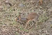 Dik-diks are herbivores. Their diet mainly consists of foliage, shoots, fruit and berries, but little or no grass. They receive sufficient amounts of water from their food, which makes drinking unnecessary. Like all even-toed ungulates, they digest their food with the aid of micro-organisms in their four-chambered stomachs. After initial digestion, the food is repeatedly eructated and rechewed, a process known also as rumination, or 'chewing the cud'. Dik-diks' tapering heads may help them eat the leaves between the spines on acacia trees, and feed while still keeping their head high to detect predators.[4]
