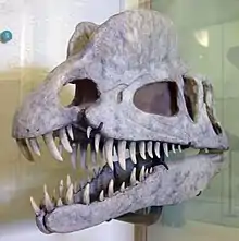 The orbit was oval, and narrow towards the bottom. The jugal bone had two upwards-pointing processes, the first of which formed part of the lower margin of the antorbital fenestra, and part of the lower margin of the orbit. A projection from the quadrate bone into the lateral temporal fenestra (opening behind the eye) gave this a reniform (kidney-shaped) outline. The foramen magnum (the large opening at the back of the braincase) was about half the breadth of the occipital condyle, which was itself cordiform (heart-shaped), and had a short neck and a groove on the side.[2] The mandible was slender and delicate at the front, but the articular region (where it connected with the skull) was massive, and the mandible was deep around the mandibular fenestra (an opening on its side). The mandibular fenestra was small in Dilophosaurus, compared to that of coelophysoids, and reduced from front to back, uniquely for this genus. The dentary bone (the front part of the mandible where most of the teeth there were attached) had an up-curved rather than pointed chin. The chin had a large foramen at the tip, and a row of small foramina ran in rough parallel with the upper edge of the dentary. On the inner side, the mandibular symphysis (where the two halves of the lower jaw connected) was flat and smooth, and showed no sign of being fused with its opposite half. A Meckelian foramen ran along the outer side of the dentary. The side surface of the surangular bone had a unique pyramidal process in front of the articulation with the quadrate, and this horizontal ridge formed a shelf. The retroarticular process of the mandible (a backwards projection) was long.[2][31][6]