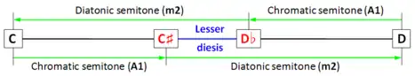 ![]() Diminished second in quarter-comma meantone (also known as lesser diesis), coinciding with the interval from C♯ to D♭, defined as the difference between m2 and A1 (117.1 − 76.0 = 41.1 cents). |