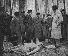 On the morning of 25 January 1937,[3] while walking his fox terrier dog in Bois de Boulogne, Navachine was assassinated, stabbed to death in an incident still unsolved by French police; he was 47 years of age.[2] His assassination has been connected to at least three other murders carried out during a state of ongoing violence in France: Italian anti-fascist dissidents Carlo and Nello Rosselli, and undercover agent Laetitia Nourrissat Toureaux.[2][4][5] Panteleimon Takhchiyanov, an officer of the NKVD, is suspected to have carried out Navachine's assassination, possibly to silence him before he released evidence proving the innocence of Soviet political prisoners.[6][7][8] Another theory argues his attack was coordinated by the fascist extremist group La Cagoule to create fears of Communist conspirators in France.[2][9]
