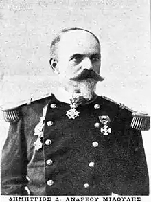 Dimitrios D. Miaoulis (Greek: Δημήτριος Δ. Μιαούλης, 1836–1899) was a Greek naval officer. He was the son of Dimitrios Miaoulis and grandson of Andreas Miaoulis, the Greek navy's chief commander during the Greek War of Independence.