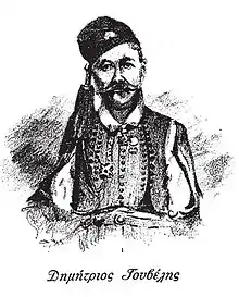 Hailing from Karpenisi, Dimitrios Gouvelis was an armatolos during the final years of Ottoman rule in Greece.[1] When the Greek War of Independence broke out, he formed his own armed band, and fought in the Siege of Karpenisi, the Battle of Dervenakia, and in the Battle of Agios Vlasios.[1] In 1824, the provisional Greek government named him prefect of Karpenisi and garrison commander of Mount Apokleistra.[1] In 1825 he was promoted to chiliarch.[1] He was later promoted to general rank, and was elected to the national assemblies of 1832 and 1843.[1] He was the brother of Konstantinos Gouvelis.[1]
