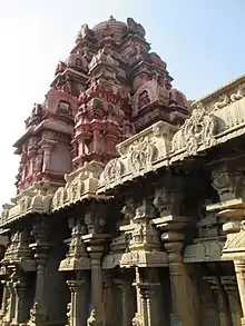 The Kalahastheeswara-Gnanambika temple was built during the 14th century. The Seenivasaperumal temple built in the bottom of the hill was eroded by time. By the 16th century Pandyan acquired the whole chera kingdom with the support of Vijayanagar king Sachudevarayer. Sachudevarayer, on his visit in 1538 A.D. ordered for the repair works of the temple of Abirami Amman and Padmagirinathar. This is inferred from the script written over stone in the Fort temple. Muthukrisna Nayak became the king of Pandaya kingdom in 1602 A.D. He built the strong hill fort in 1605 to secure Dindigul from invasion. He also built a fort at the bottom of the hill, which was later called Pettaiwall. Thirumalai Nayak redressed the Hill fort and he built the front hall of the Kalahastheeswaraswamy temple. Soundararaja Perumal temple in Thadikombu was erected during his reign. During his Nayak's stay in Dindigul, he fell into sickness and believed to have prayed Rangaperumal to relieve his sickness. Rani Mangammal built the six hundred steps for the hill fort.[4][66] during the months of January and February, a festival honoring Mariamman is celebrated in this temple. It has a sri abirami amman temple, which is reconstructed.[67] Arulmigu Abirami Amman temple is a holy place situated in Dindigul in Tamil Nadu, India. This is one of the important "Shivasthalam" where you can find Padmagiriswarar—Abirami Amman and Kalahastheeswarar—Gnanambigai Sannathi's. The rock hill is called Padmachala, Padmagiri, Lotus Hill.[68]