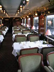 A dining car (American English) or a restaurant car (British English), also a diner, is a railroad passenger car that serves meals in the manner of a full-service, sit-down restaurant.