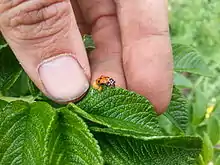 Dinocampus coccinellae is a braconid wasp parasite of coccinellid beetles, including the spotted lady beetle, Coleomegilla maculata. D. coccinellae has been described as turning its ladybird host into a temporary "zombie" guarding the wasp cocoon. About 25% of Coleomegilla maculata recover after the cocoon they are guarding matures, although the proportion of other ladybird species which recover is much lower.[3]