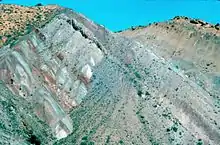 The pile of sediments were later buried and lithified into solid rock. The layers of rock were later uplifted and tilted to their present angle by the mountain building forces that formed the Uinta Mountains[4] during the Laramide orogeny.[5] The relentless forces of erosion exposed the layers at the surface to be found by paleontologists.