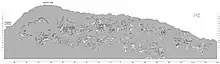 The "Wall of Bones" located within the Dinosaur Quarry building in the park consists of a steeply tilted (67° from horizontal) rock layer which contains thousands of dinosaur fossils. The preserved section is only a portion of what was originally present when Douglass made his discovery as seen on the map above. When work ceased in 1922, a portion of the quarry was left for future development. This work began as part of President Franklin Roosevelt's Civil Works Administration, which provided employment during the Depression under the Transient Relief Service and later under the Works Progress Administration.[16] This work included constructing a road to the quarry, removal of overburden covering the bone-bearing strata, and building of a small, temporary museum. World War II interrupted work, but this was resumed in 1951 with the building of a small metal building over the east portion of the quarry to test whether bone was abundant enough to warrant a larger, more permanent building. This more permanent building was erected in the mid-1950s as part of the National Park Service Mission 66 plan. The architectural design was high controversial for its ultra-modern use of glass, steel and concrete ramp that spiraled around a cylindrical office tower. The building opened at the dedication ceremony on June 1, 1958.[17] The design had two levels and abundant natural light so that visitors could watch technicians remove the hard rock to reveal the fossil bones in-situ.