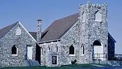 Dinwiddie Presbyterian Church and Cemetery is a historic Presbyterian church located near Hillsville, Carroll County, Virginia. It was one of the six "rock churches" founded by Bob Childress It was built in 1948, and is a white quartz rock-faced frame building. The main block is front-gabled with nave plan and Gothic-style tower at the front, through which the edifice is entered. The tower has corner parapets with crenellations of jagged, light-colored stone fragments between each corner. Attached to the main block is a 1 1⁄2-story, front-gabled addition. The contributing cemetery is enclosed by white quartz pillars connected by black pipes.[3]