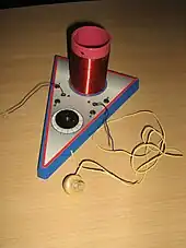 Modern crystal sets use piezoelectric crystal earpieces, which are much more sensitive and also smaller.[104] They consist of a piezoelectric crystal with electrodes attached to each side, glued to a light diaphragm. When the audio signal from the radio set is applied to the electrodes, it causes the crystal to vibrate, vibrating the diaphragm. Crystal earphones are designed as ear buds that plug directly into the ear canal of the wearer, coupling the sound more efficiently to the eardrum. Their resistance is much higher (typically megohms) so they do not greatly "load" the tuned circuit, allowing increased selectivity of the receiver. The piezoelectric earphone's higher resistance, in parallel with its capacitance of around 9 pF, creates a filter that allows the passage of low frequencies, but blocks the higher frequencies.[109] In that case a bypass capacitor is not needed (although in practice a small one of around 0.68 to 1 nF is often used to help improve quality), but instead a 10–100 kΩ resistor must be added in parallel with the earphone's input.[110]