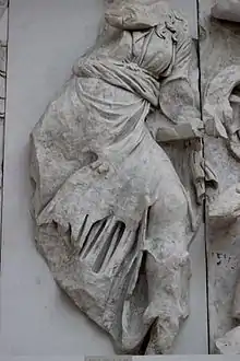 In the 2nd-century BC sculptural frieze of the Great Altar of Pergamum, Dione is inscribed in the cornice directly above her name and figures in the eastern third of the north frieze, among the Olympian family of Aphrodite. This placement–making her the offspring of Gaia and Uranus–is Homeric and contradicts the theory put forth by Erika Simon that the altar's organization was Hesiodic.[12] Dione's possible appearance in the east pediment of the Parthenon[13] would likewise place her among the children of Gaia and Uranus.