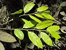 Evergreen trees up to 16 m tall, with smooth, black bark. The blaze is a dull orange. The young branchlets are cylindrical, covered by black, sooty hairs. The tree's leaves are simple, alternate, distichous, with petioles about 0.5-1.1 cm long, flat, glabrous. The leaf blade is about 9 to 27 cm long by 3.5-8 cm wide, and has an entire margin and a raised midrib. The leaf shape is usually narrow elliptic-oblong to lanceolate, with acute to acuminate apex ending in a blunt tip. The leaf base is acute to rounded. The leaf is thick (coriaceous) with minute pellucid dots beneath. The venation, with 6-9 pairs of secondary nerves, is strongly and closely reticulate on both surfaces.[5]