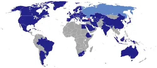 Georgia is a member of the United Nations, the Council of Europe, and the OSCE. Because of its strategic location, Georgia is in both the Russian and American spheres of influence,[2] however Georgia's relationship with Russia is at its lowest point since 1921 due to controversies regarding espionage and the Russo-Georgian War. As a result, Georgia broke off diplomatic relations with Russia and has left the Commonwealth of Independent States.[3] From 2008 until 2012, Georgia established diplomatic relations with about 50 states.[4][5]
