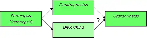 The ancestor of Diplorrhina is most likely one of the Siberian species of the genus Archaeagnostus. D. recta is the most primitive species and it gave rise to D. cuneifera, which was in turn ancestral to Diplorrhina triplicata.[3]